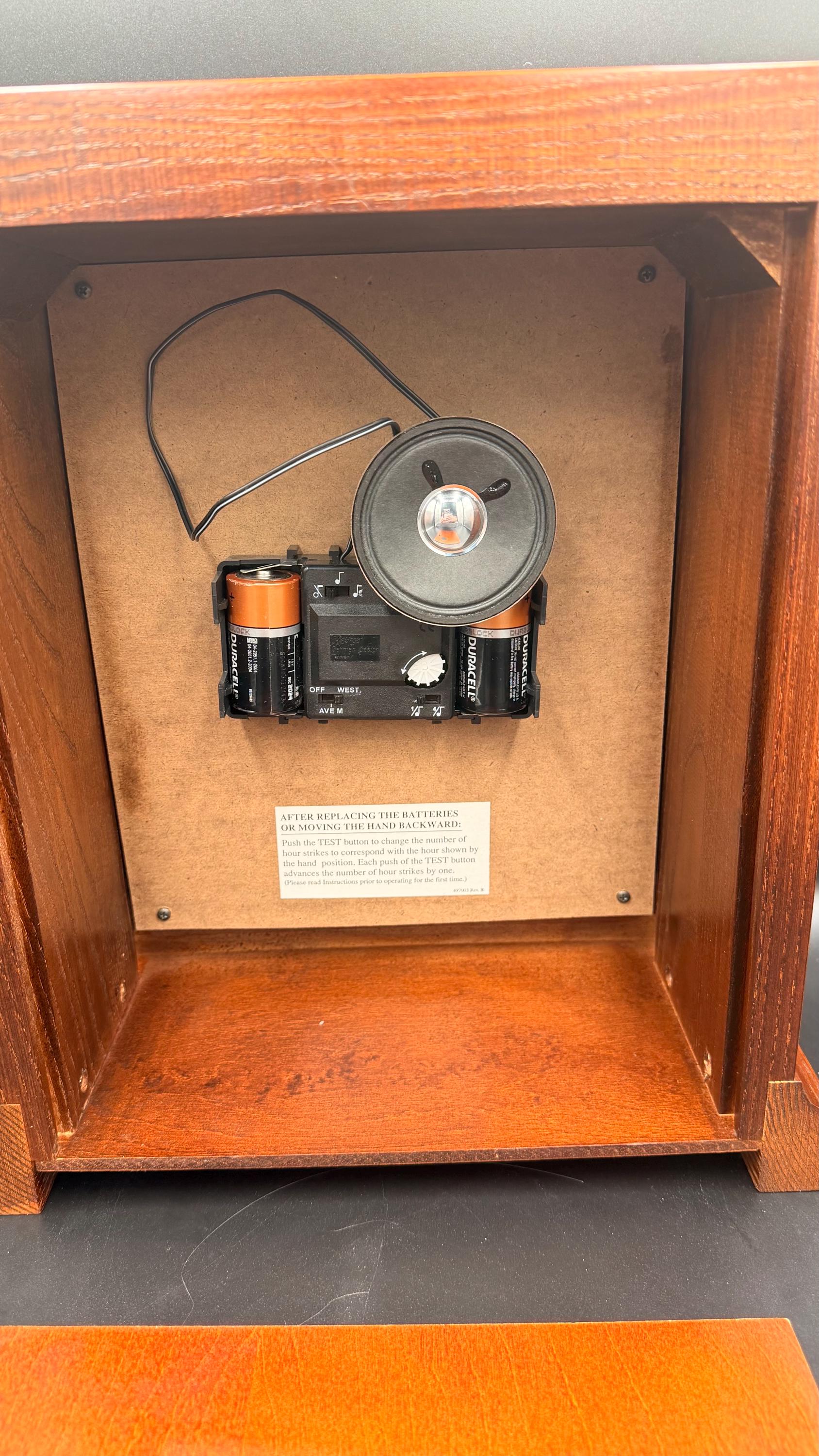 Model 630-165 offers clean architectural lines with a warm cherry finish and classic Arabic numeral dial. It’s substantial without being oversized — perfect for a bookshelf, desk, office credenza, or fireplace mantel.