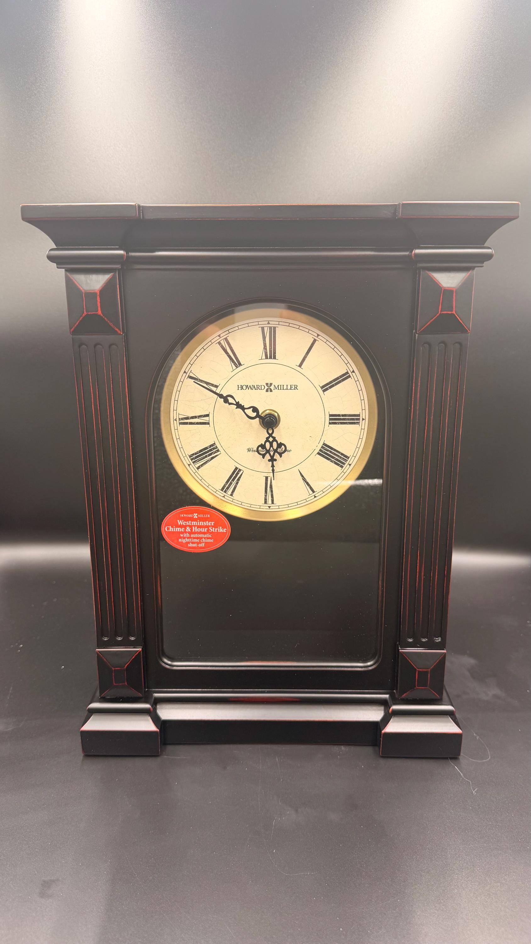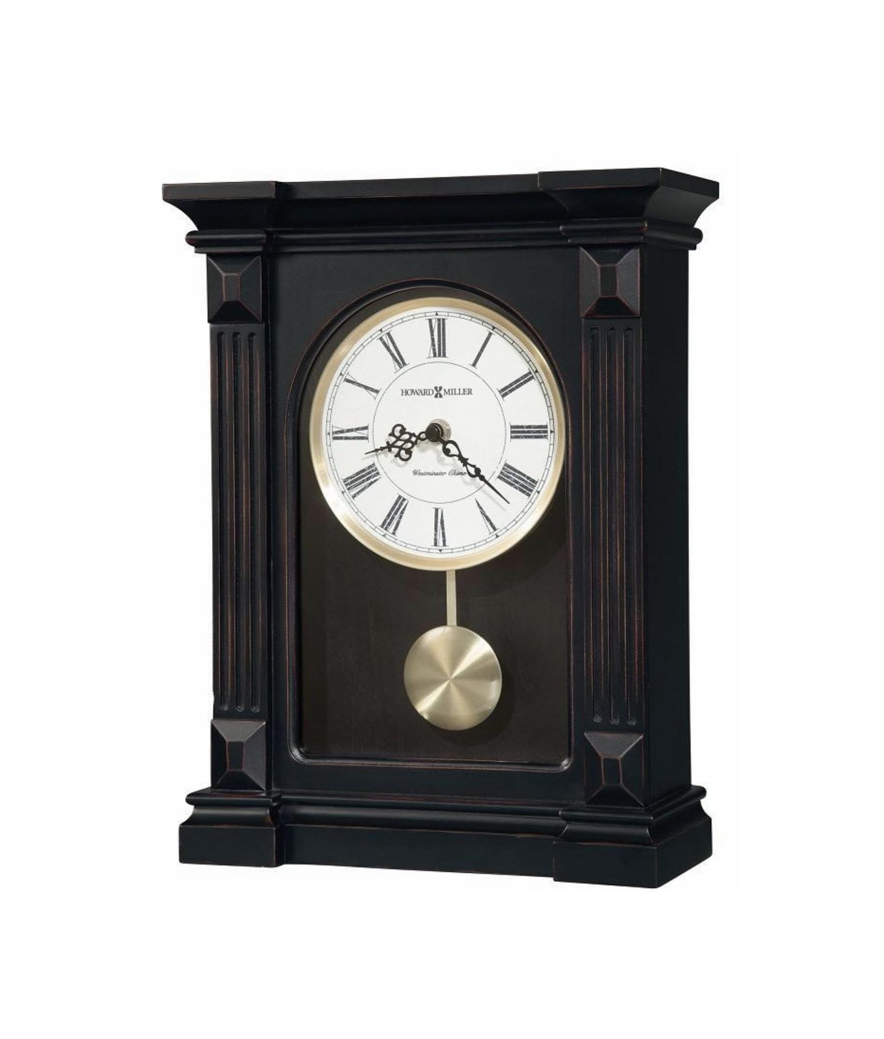 New in Box! The Howard Miller Mia mantel clock is finished in Worn Black with red and brown undertones on select hardwoods and veneers. This handsome mantel clock features fluted columns with raised beveled column caps and flat glass that encase the dial and brushed antique brass-finished pendulum bob with brass-finished stick. Aged dial with aged black Roman numerals, black serpentine hands, and a brushed antique-brass finished bezel.