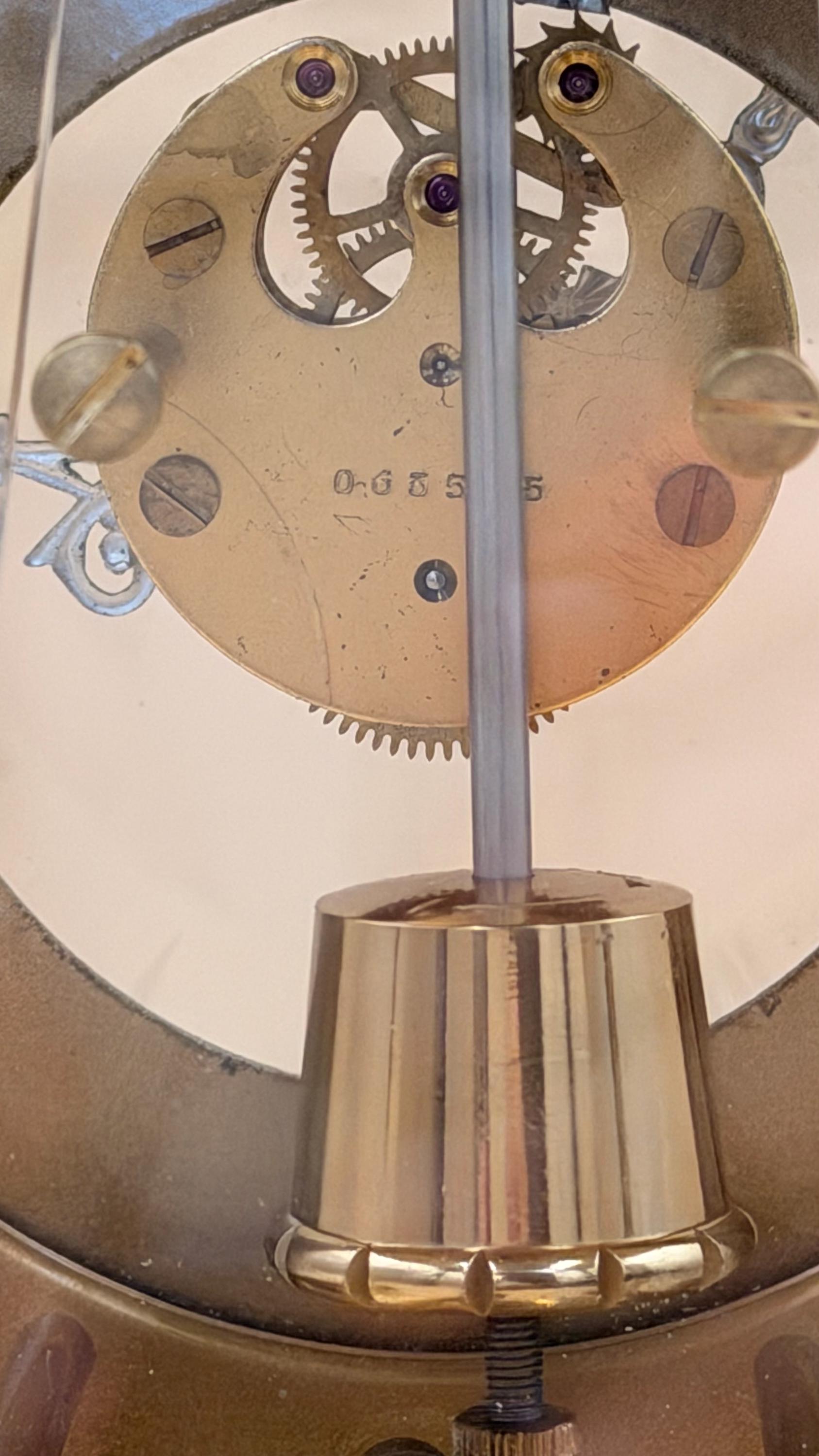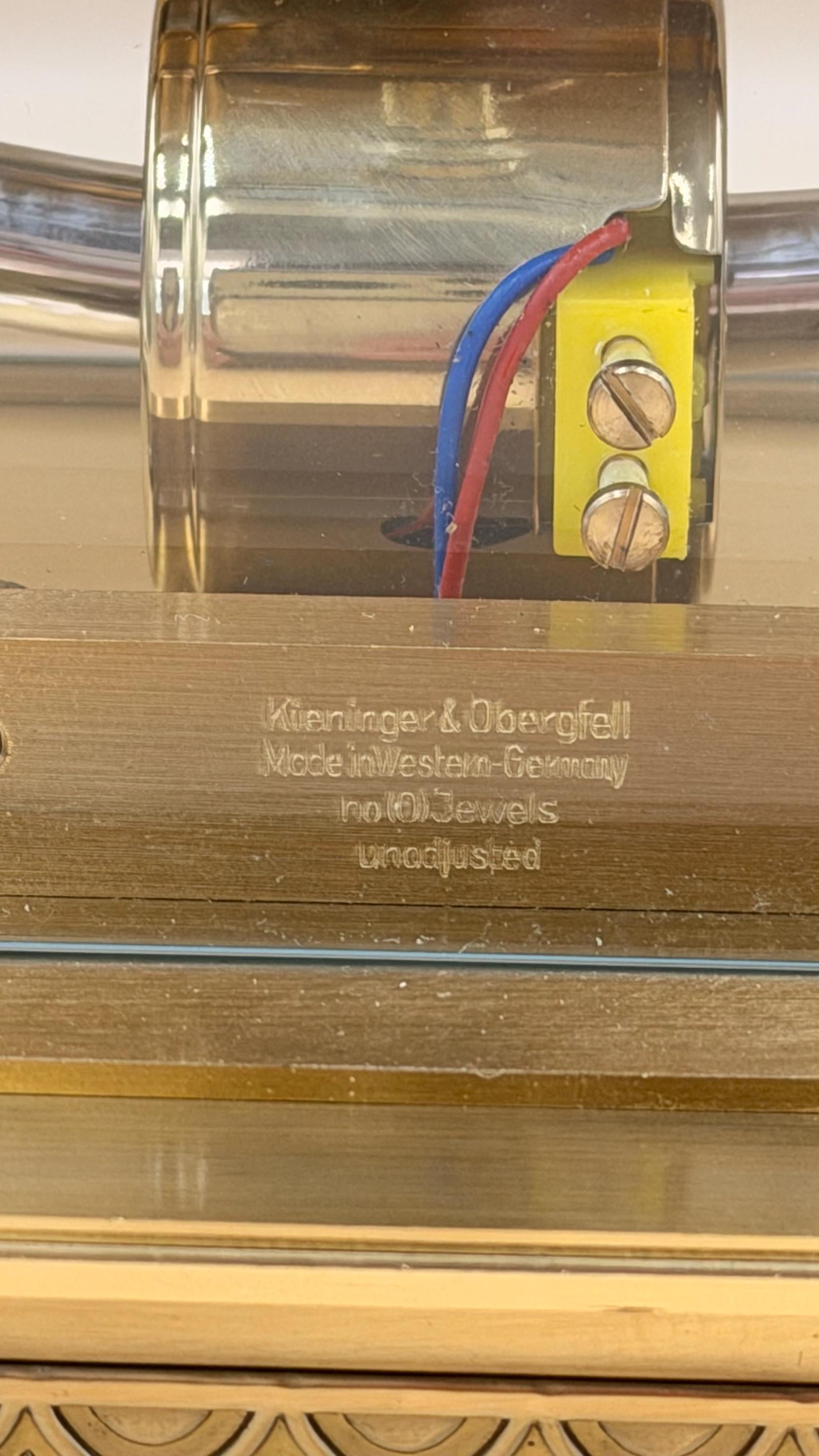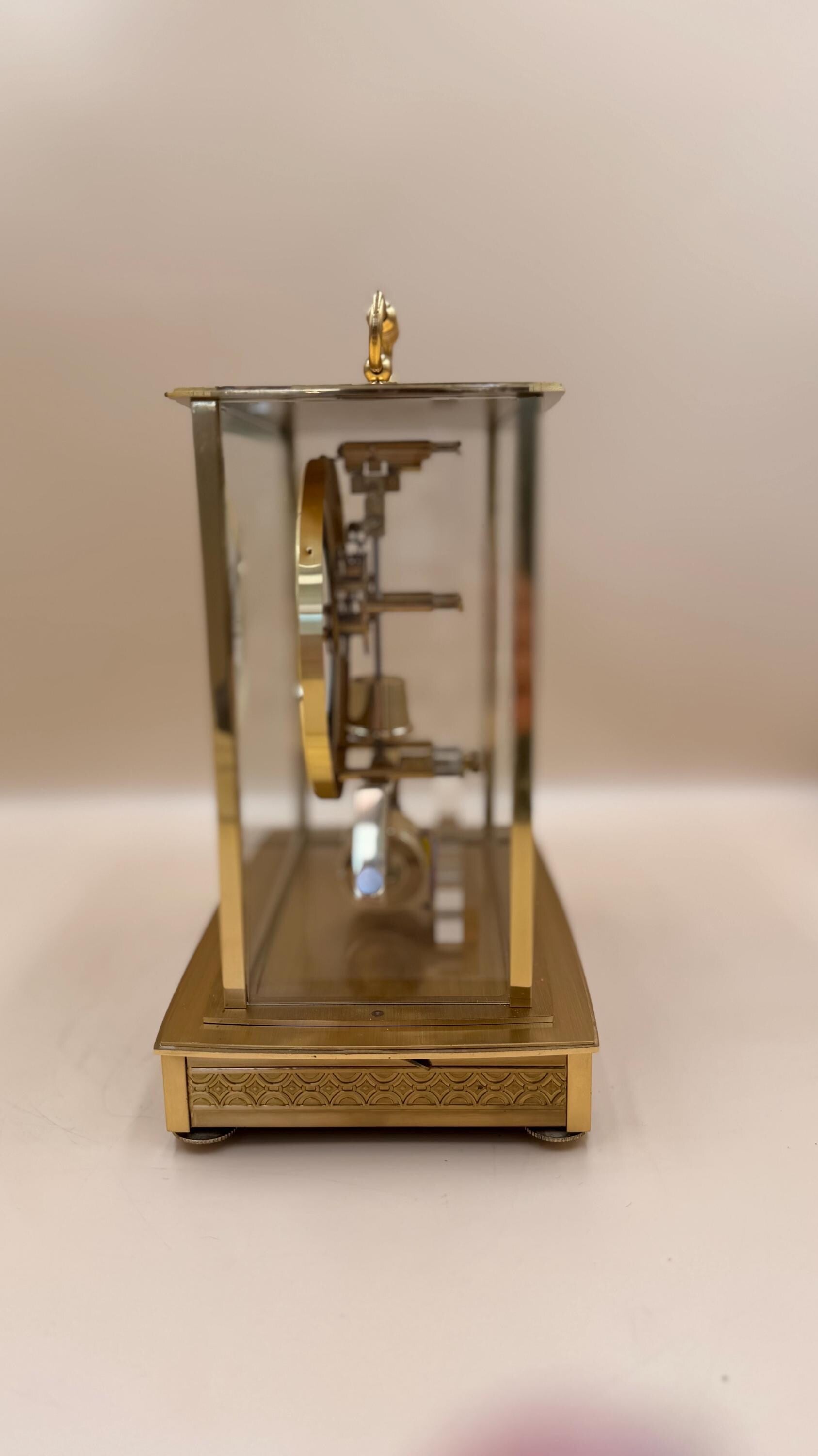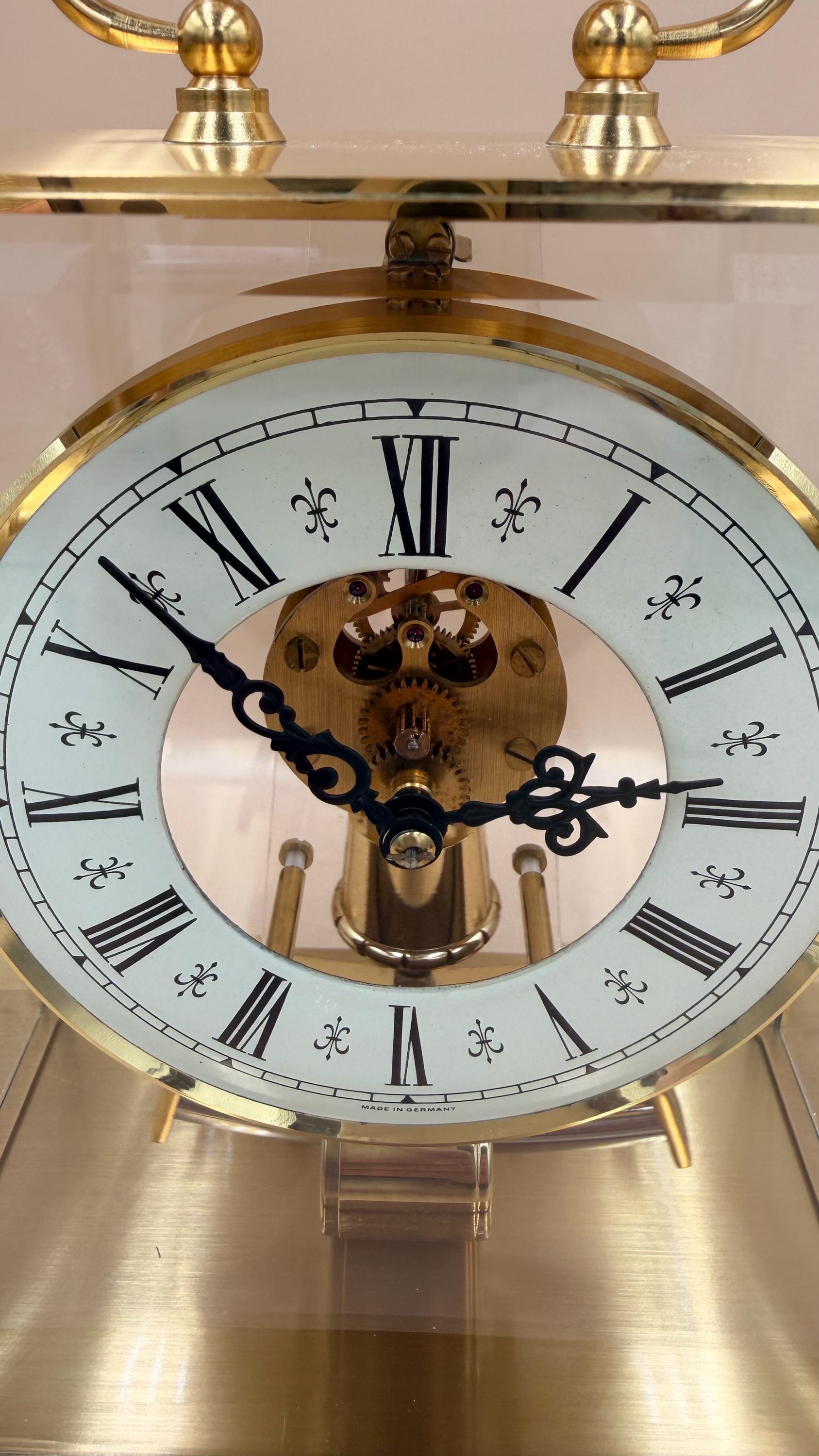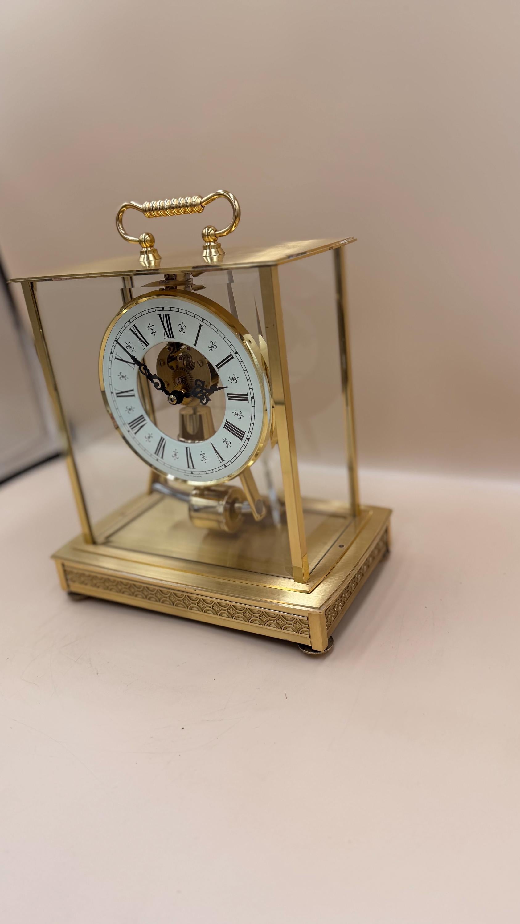 An elegant and highly distinctive Seth Thomas electro-magnetic mantel / desk clock, featuring a West German–made Kieninger-Obergfell movement and an upgraded 6-jewel gear train. This clock blends mid-century modern design with visible mechanical artistry, housed in a striking brass and glass architectural case.